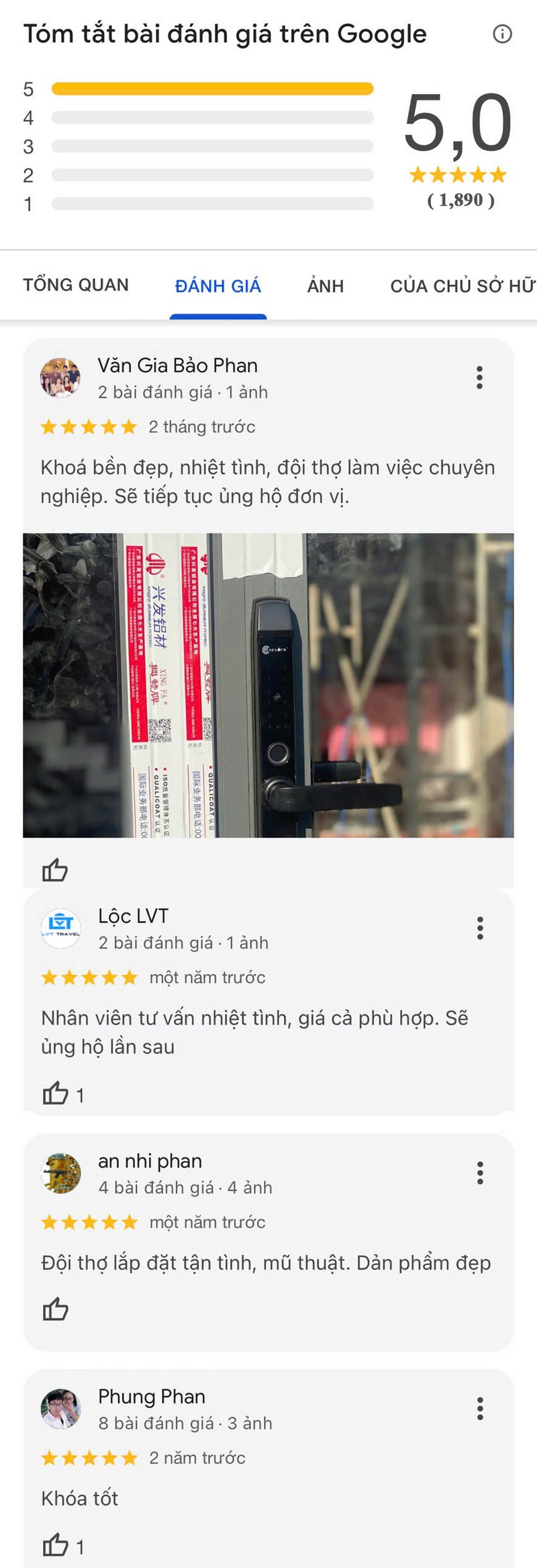 Không phải ngẫu nhiên mà hơn 1.890 sản phẩm khóa cửa thương hiệu OneLock được bán ra chỉ tính riêng ở Hải Phòng, sau khi sử dụng một thời gian thì khách hàng đã nhận xét về chất lượng khóa cửa OneLock trực tiếp từ Google với điểm số tuyệt đối 5*.